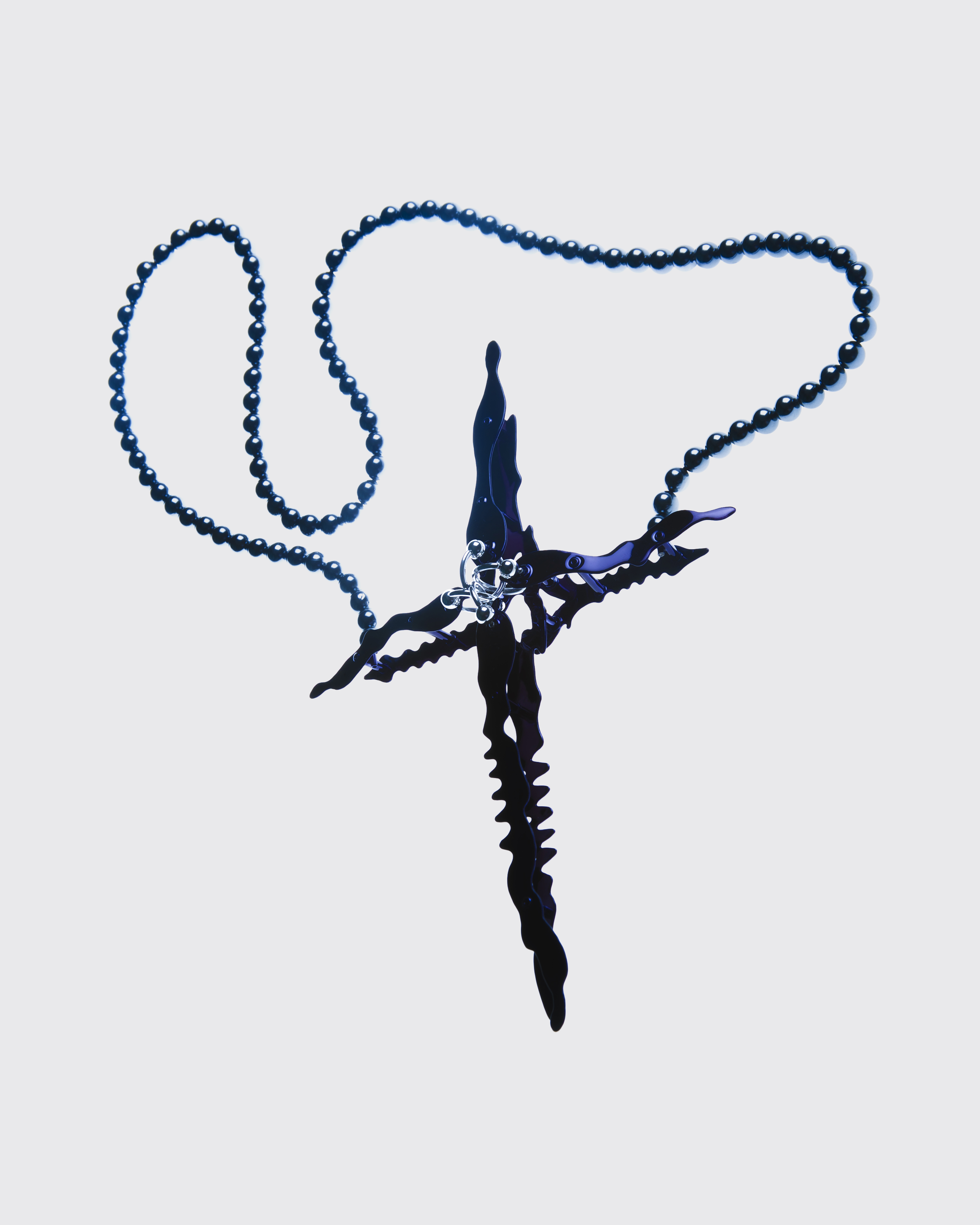 The Third Lotus Prince is a mythological deity that has the body of a lotus and who fights dragons in search of a new body. This quest for a new identity leads them into acts of rebellion and sacrifice, often at odds with the reigning rules and regulations in society-at-large. Floating somewhere in between the physical and cybernetic domain, this collection of contemporary adornments visualizes and materializes the magical weaponry of the Third Lotus Prince from a queer-dominated perspective. By positioning the mythological God in an unapologetically queer hyperstitional reality, Hansel creates room for an alternative interpretation of notions surrounding identity, sexuality and power. With this timely interpretation of a century-old myth, Hansel challenges us to further explore and interrogate our banal conceptions of life in the past, present, and the apocalyptic future.